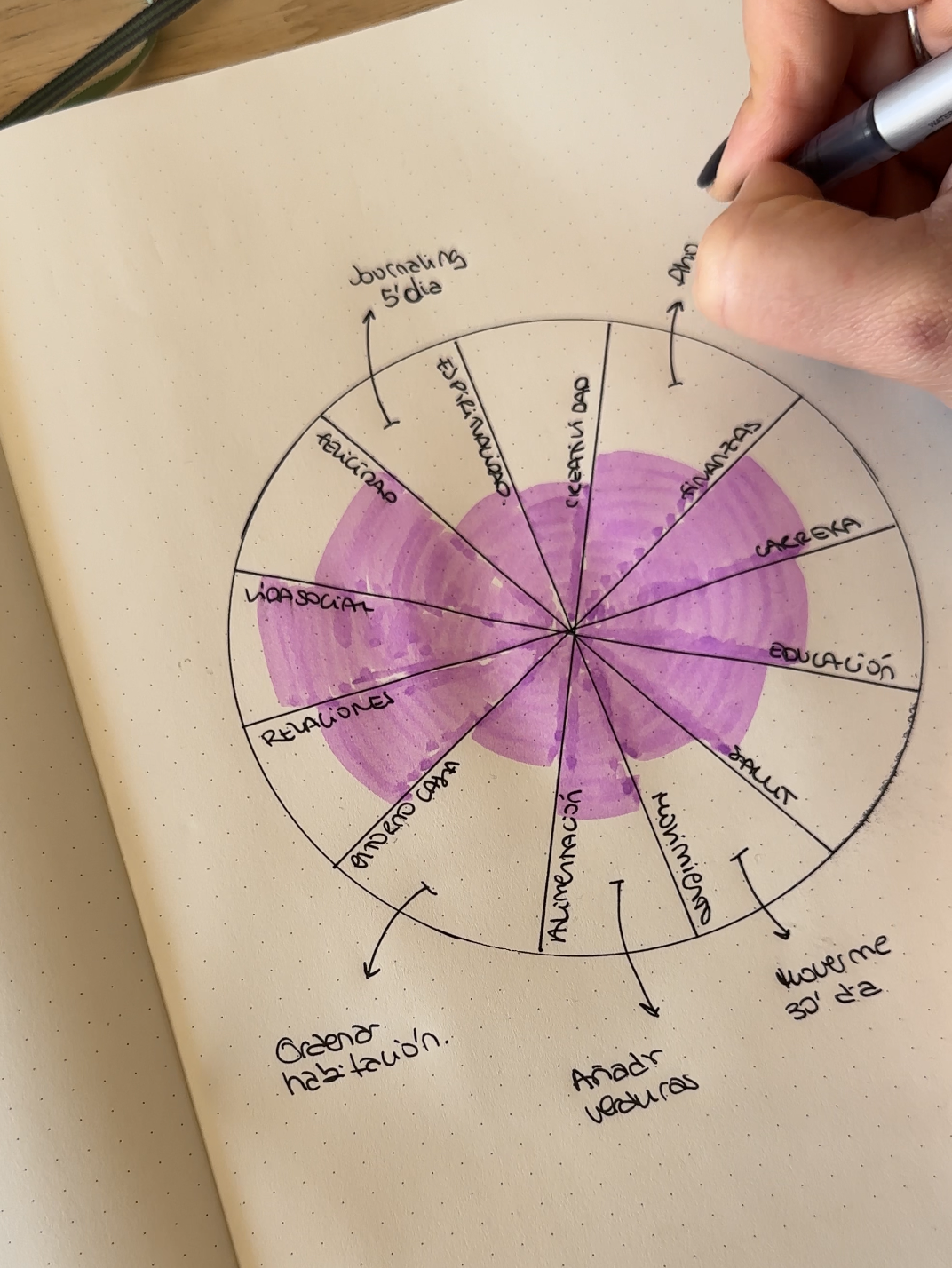 Pinta cada área en base a la puntuación que has pensado. El resultado visual es muy revelador: verás si tu vida está equilibrada… o si hay áreas que necesitan más atención